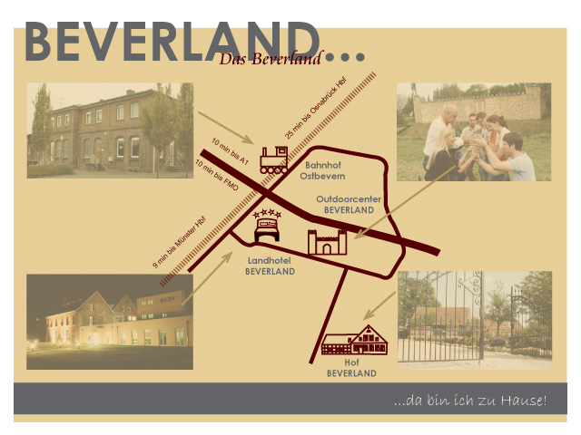 Der Dreh- und Angelpunkt des Beverlands ist das Landhotel Beverland mit dem Hof Beverland, dem Outdoorcenter Beverland und dem Beverland Bahnhof Ostbevern.